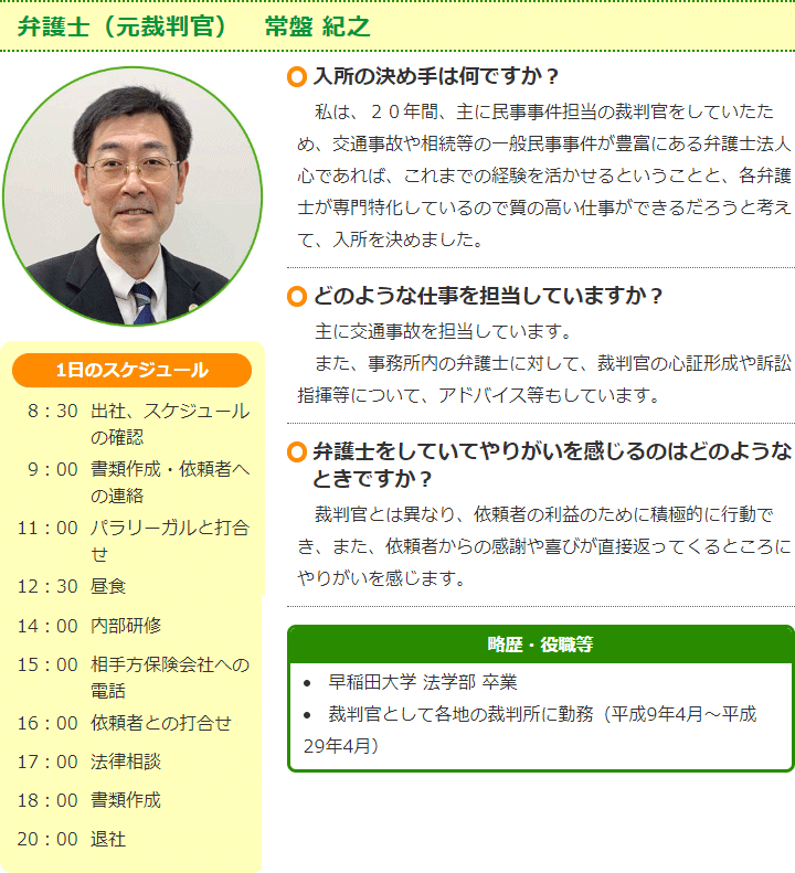 弁護士法人心は、損保会社や自賠責調査事務所のOBを入れるなど交通事故にとても力を入れており、案件数も多く、専門分野を築くには最適だと考えて入所を決めました。